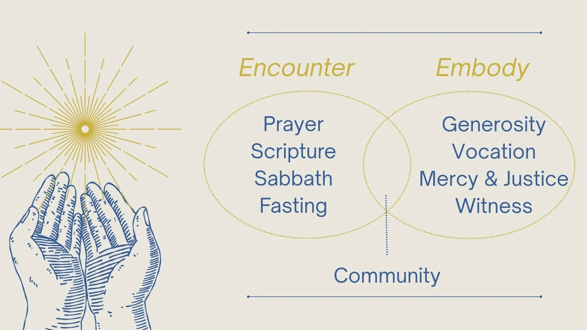 All of these practices in our EWLA Rhythm of Life comprise how we worship God and step into our mission: to encounter and embody the hospitality of God. We offer these practices to God as the worship of our lives, both in encountering the person of Jesus and being on mission with Him in how we embody his welcome and love. Some of these practices focus on encountering: Prayer, Scripture, Sabbath, Fasting. Others highlight embodying God's hospitality: Generosity, Vocation, Mercy & Justice, and Witness. The beauty in embodying God's hospitality is that we also encounter God and receive his love and filling for ourselves along the way. Lastly, all the practices are done both personally and in community, and therefore the practice of community is a practice of both encountering and embodying the hospitality of God as we step into our mission.